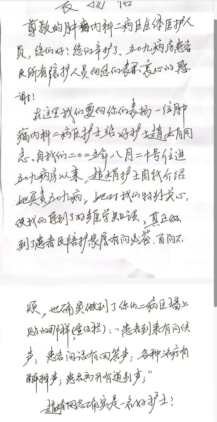 “患者到来有问候声;患者问话有回答声;各种治疗有解释声;患者离开有道别声”,这是交大一附院肿瘤内科2病区墙上宣传栏的服务承诺,而护士赵娟用实际行动将其化作了患者心中的温暖印记。近日,509病房患者及陪护人员的一封手写表扬信,揭开了这位“有问必答、百问不烦”的好护士的暖心日常。
