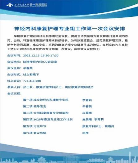 为进一步整合多院区神经内科康复护理资源,规范康复护理服务流程,提升专科护理质量与科研教学水平,近日,在神经内科屈彦护士长、牟春英副护士长的统筹安排下,我院神经内科多院区康复护理专业组正式成立,并采取线上线下相结合的形式召开第一次工作会议。科室各病区护士长、康复专科护士、联络员及科研骨干共20余人参会,会议由李青莉主持。