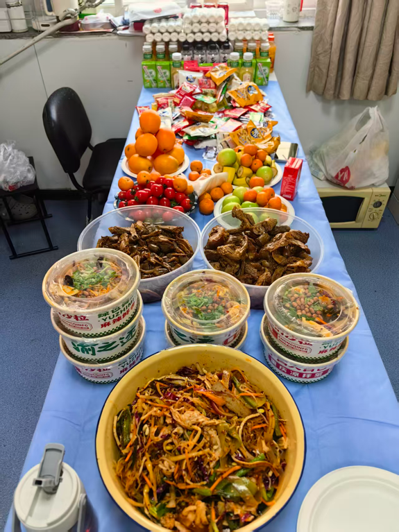 热腾腾的饺子出锅,配上爽口的凉菜、甜润的水果,以及那份带着家庭温度的蛋挞和披萨,简单的饭菜显得格外丰盛。暂时褪下白大褂的同仁们围坐享用,分享着食物,也交换着轻松的笑语,窗外寒意正浓,室内却暖意融融。