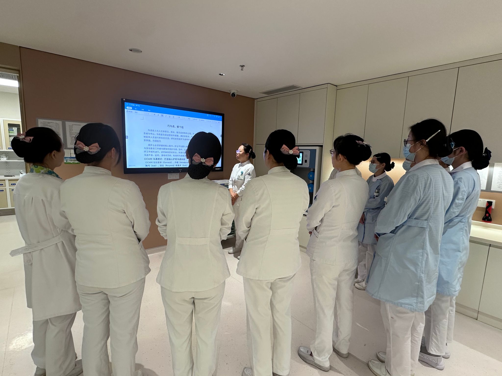 2025年12月23日晨9点,陆港心血管内科病区开展CICARE沟通模式相关知识床旁培训,由贾娅琼护士长主持,各层级护理人员参加。