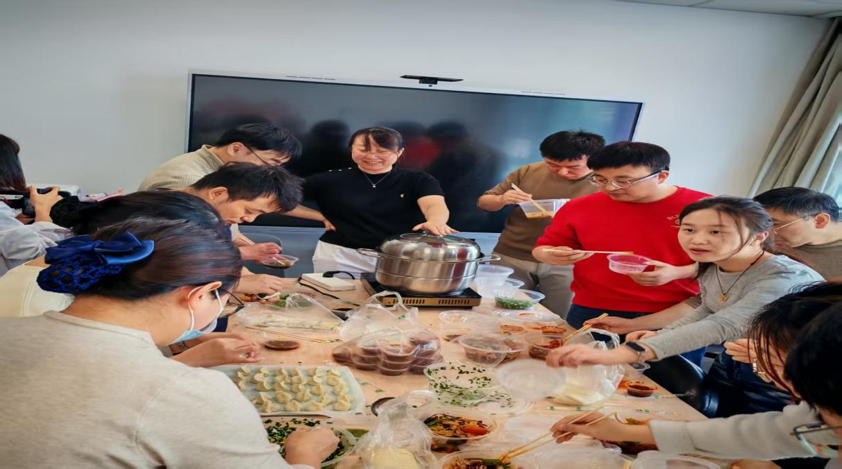 随着第一锅饺子下锅,“咕嘟咕嘟” 在沸水中翻滚冒泡,会议室的窗户渐渐蒙上一层薄薄的白雾。窗边 “你好冬至” 的横幅在暖光映照下格外温馨,墙面上贴满写着 “顺遂”“喜乐” 的小卡片,与氤氲的饺子蒸汽缠绕在一起,连空调吹送来的风都裹挟着浓郁鲜香。