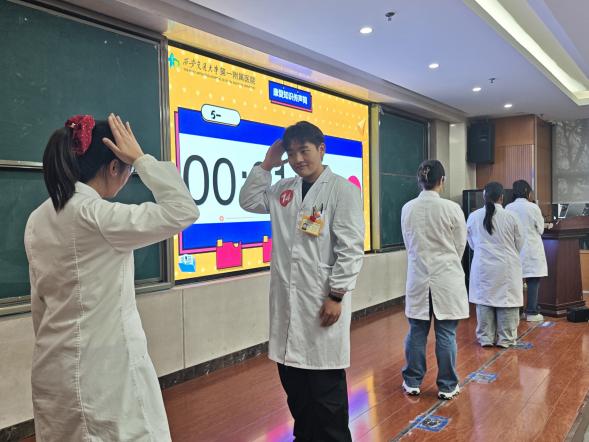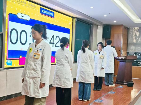 大赛第一环节--“康复知识传声筒”充满趣味与挑战,各队选手依次传递康复医学核心知识点、临床规范等内容,既考验团队协作默契,又检验知识掌握的精准度。选手们反应敏捷、配合默契,在紧张欢乐的氛围中展现了扎实的理论功底,现场掌声不断。