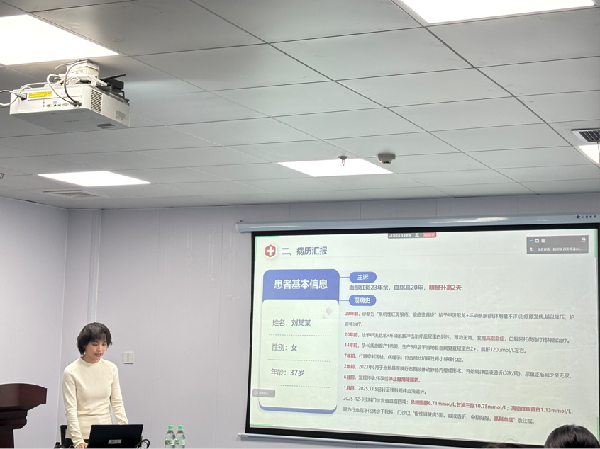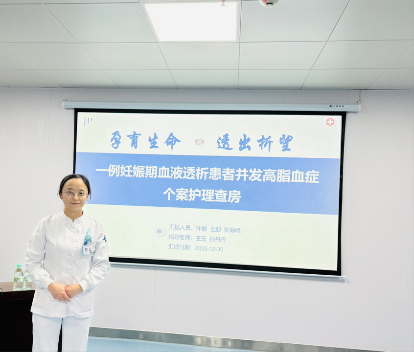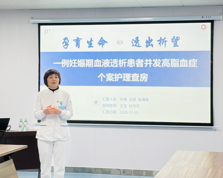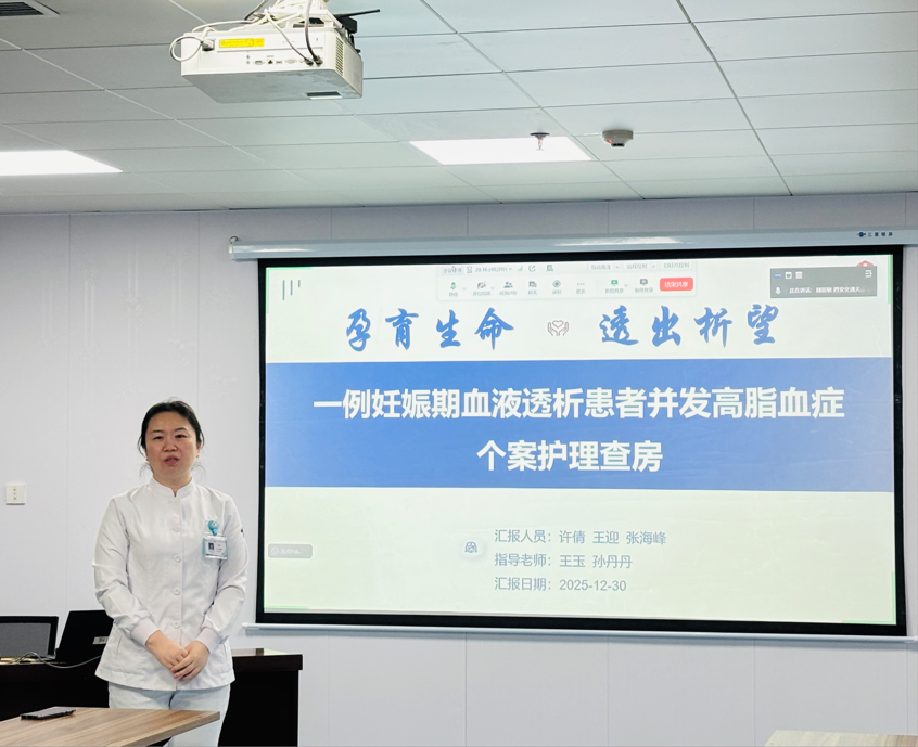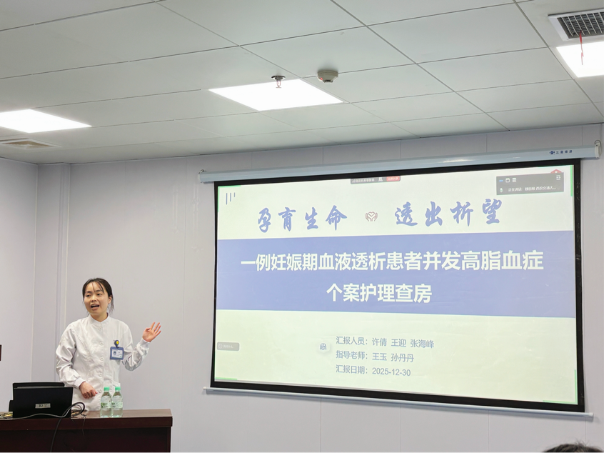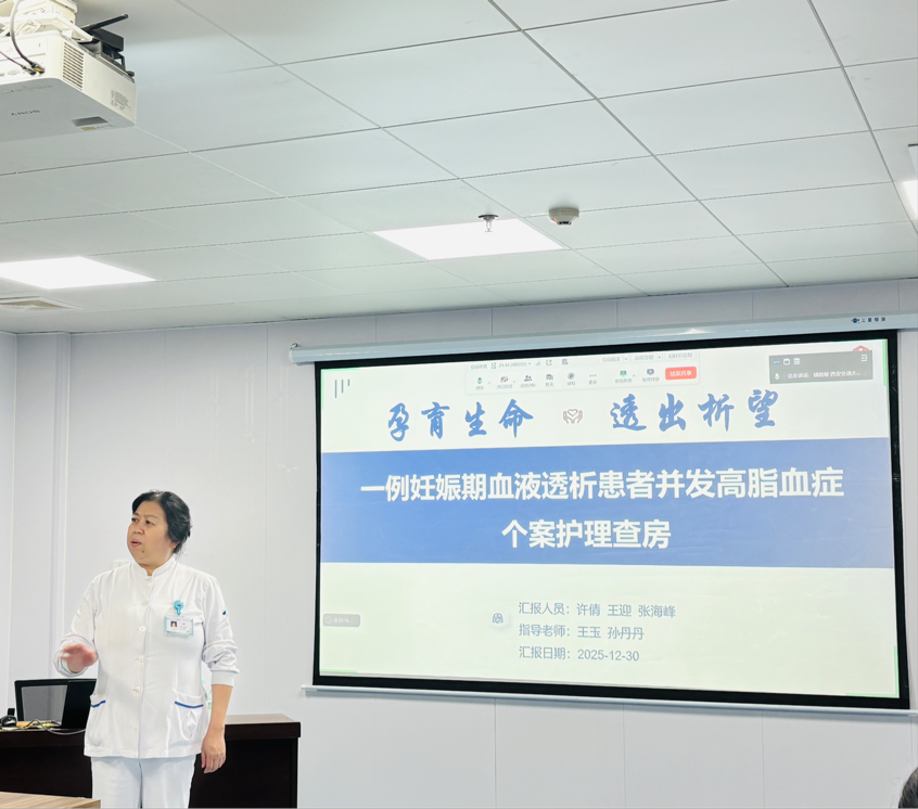 为提升护理人员对妊娠合并终末期肾病患者的综合管理能力,2025年12月30日,一场特殊的护理查房在重症肾脏病•血液净化科会议室举行。本次查房聚焦一例“妊娠期血液透析合并高脂血症”的复杂病例,采用线上与线下相结合的方式,吸引了辖区各单元护士长、护理骨干及进修护士约100余人参与。