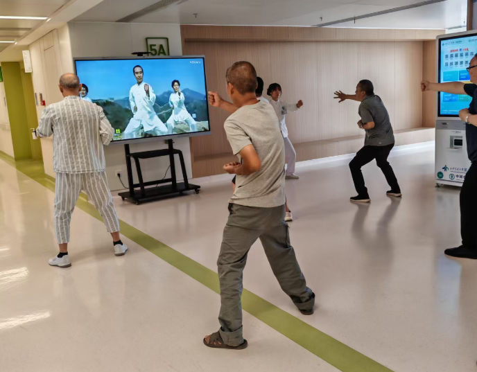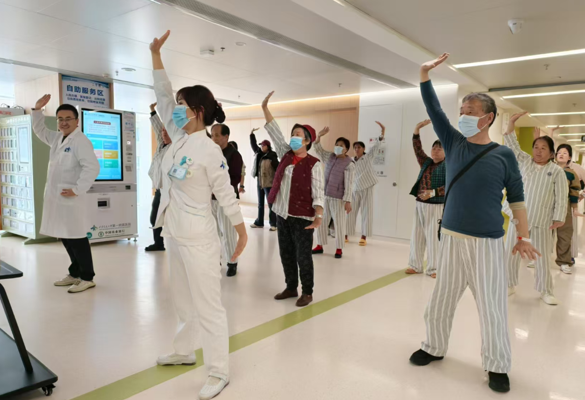 团队将抗阻训练、呼吸训练融入日常护理,为慢性心衰患者开展缩唇呼吸训练,帮助患者缓解呼吸困难;为心脏术后患者开展上肢弹力带训练,逐步恢复肢体肌力。每周二、四下午,病区大厅便会响起轻柔的节拍,护理人员带领住院患者练习八段锦,原本略显沉寂的病区,在舒展的动作里有了鲜活的温度,累计50场集体训练,700余名患者在一呼一吸之间,重拾对健康的信心。