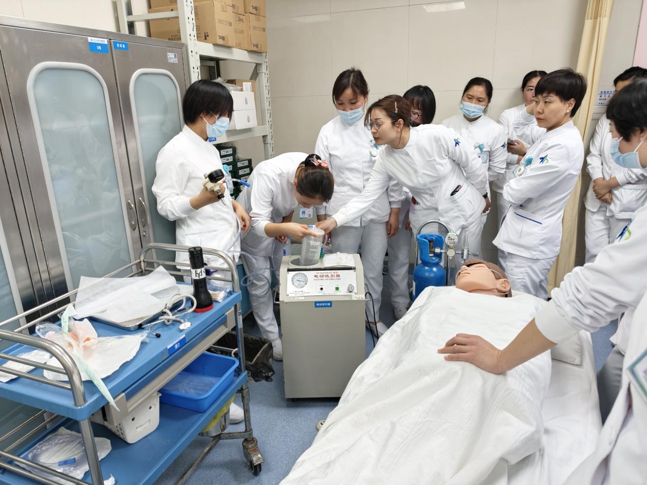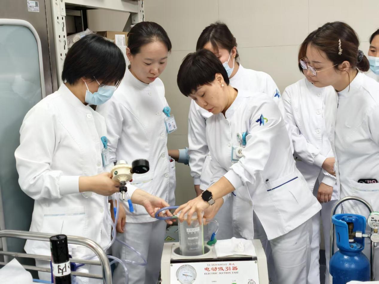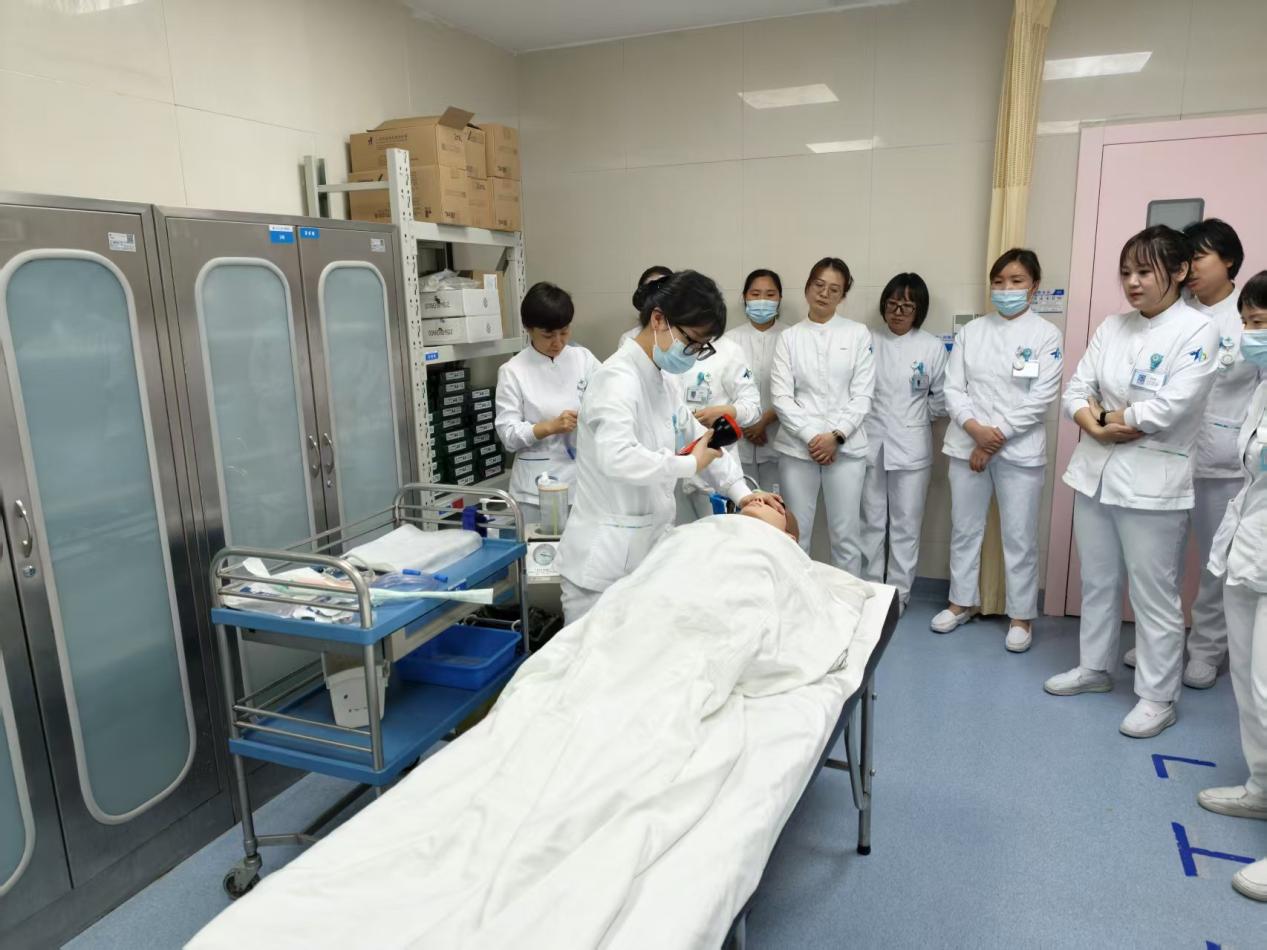 培训开始,病区继教组长王荣荣老师依次进行四项操作的规范化培训,过程中,王荣荣老师细致讲解每一个细节步骤的作用及原理,如吸痰管进入气道的深度、吸痰时间、心肺复苏按压的深度及频率、简易呼吸器面罩固定手法、除颤电极板放置位置等,保证所有人员充分理解,避免在后续实际操作过程中出现错误。