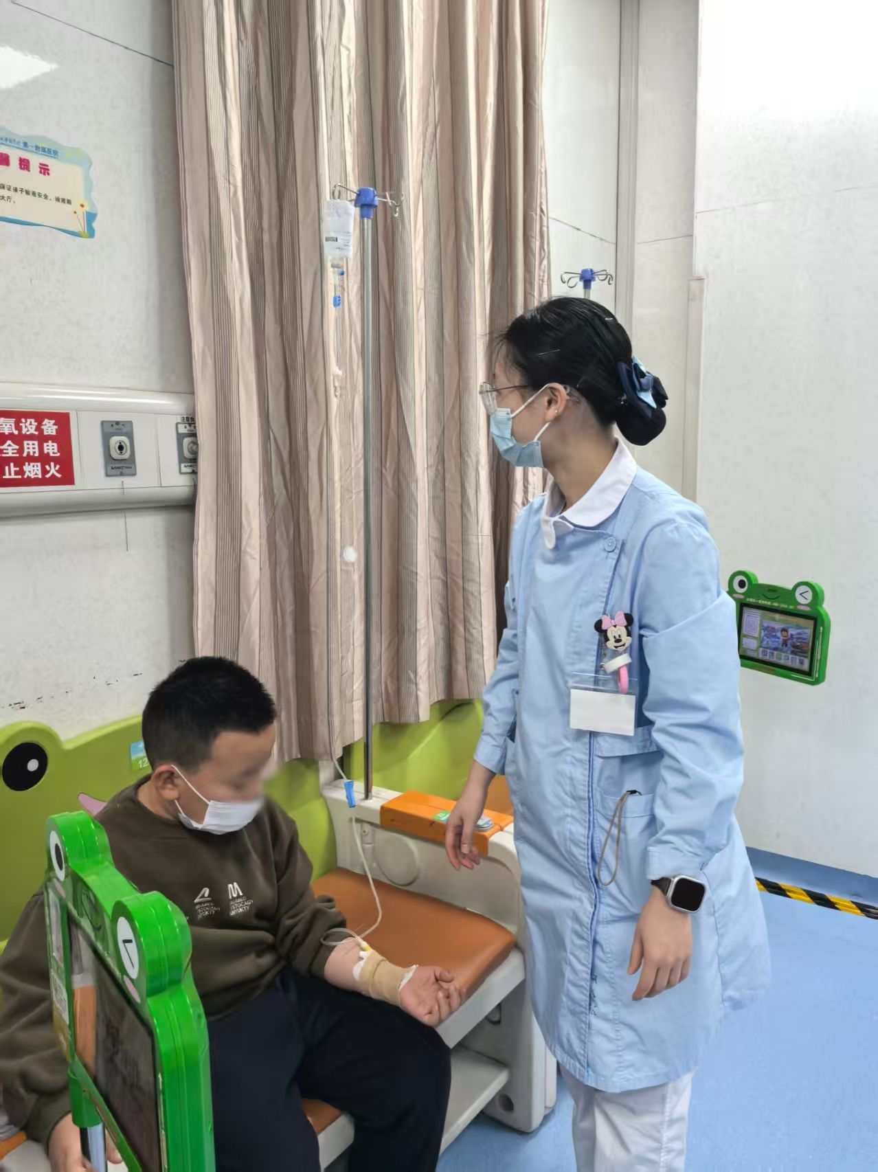 儿科门诊的清晨,总是被孩子们的啼哭声、家长的叮嘱声交织填满,这份热闹与成人科室的沉静截然不同。第一次走进诊室,看着攥着家长衣角、眼神怯生生的患儿,我突然意识到,这里的护理工作远不止“精准操作”那么简单。成人患者能清晰诉说“头痛”“乏力”,能在输液时保持固定姿势,可孩子们只会用哭闹表达不适,用躲闪抗拒治疗。记得我第一次尝试为一名三岁患儿做雾化吸入,刚拿出雾化面罩,孩子就“哇”地一声哭了出来,手脚不停地挣扎,家长也跟着手足无措。我握着面罩的手僵在半空,生怕动作不当吓到孩子。就在这时,带教老师轻轻走过来,指着电视机里的动画片,蹲下身柔声对孩子说:“宝贝你看,这个动画片里面的是谁啊,多么勇敢的……”趁着孩子注意力被吸引,老师一边温柔安抚,一边示意我调整雾化器,“动作要轻,贴合口鼻但别压到脸颊,雾化时要观察孩子的呼吸,别让雾气药液呛到。”在老师的指导下,雾化终于顺利完成,孩子不哭了,还拉着我的衣角,那一刻,我心里涌起一股难以言喻的暖流——原来儿科护理,是要用爱心和童趣搭建沟通的桥梁,这是我在成人科室从未体会过的柔软与感动。
