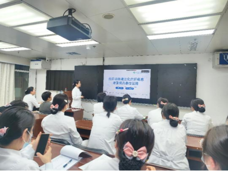 本期分享会由肝胆外科副护士长董芳芳主持,肝胆外科2病区和消化内科2病区的两位护理硕士分别分享了高质量文献。首先,杨鑫护师分享了题为《围术期口服益生菌对胰十二指肠切除术后感染性并发症的影响》的论文。该研究聚焦于肝胆外科最具挑战性的手术之一,探讨了通过微生态调节这一创新性干预手段,来降低术后复杂感染并发症的可能性。这一主题为围术期患者的精细化营养管理与感染预防打开了新的思路。