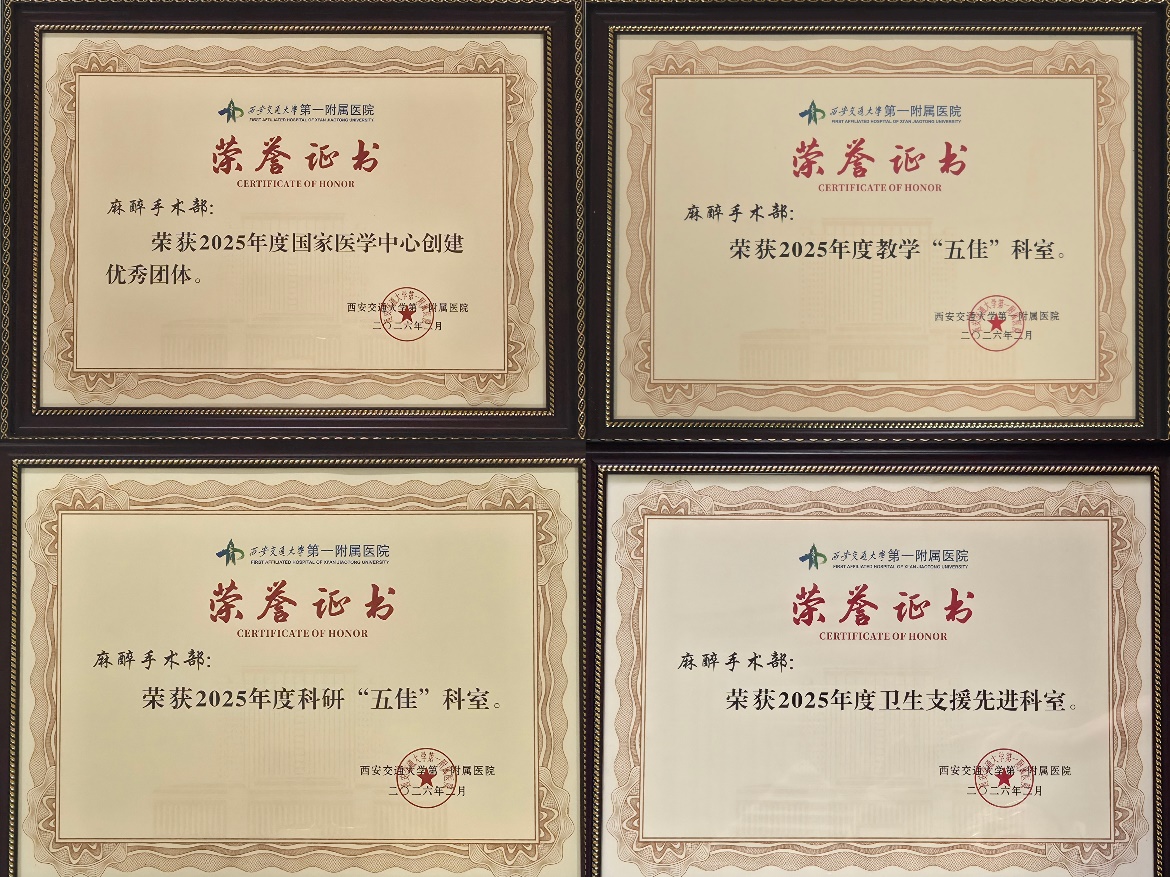 骏马奔腾开胜景,春风洋溢启新程。2026年2月9日,我院2025年度表彰大会上,麻醉手术部喜获“国家医学中心创建优秀团体”、“教学五佳科室”、“科研五佳科室”、“卫生支援优秀科室” 四项重磅荣誉,覆盖学科建设、医疗、教学、科研与社会服务,是医院对科室年度工作的高度认可,彰显了科室的综合实力与责任担当。