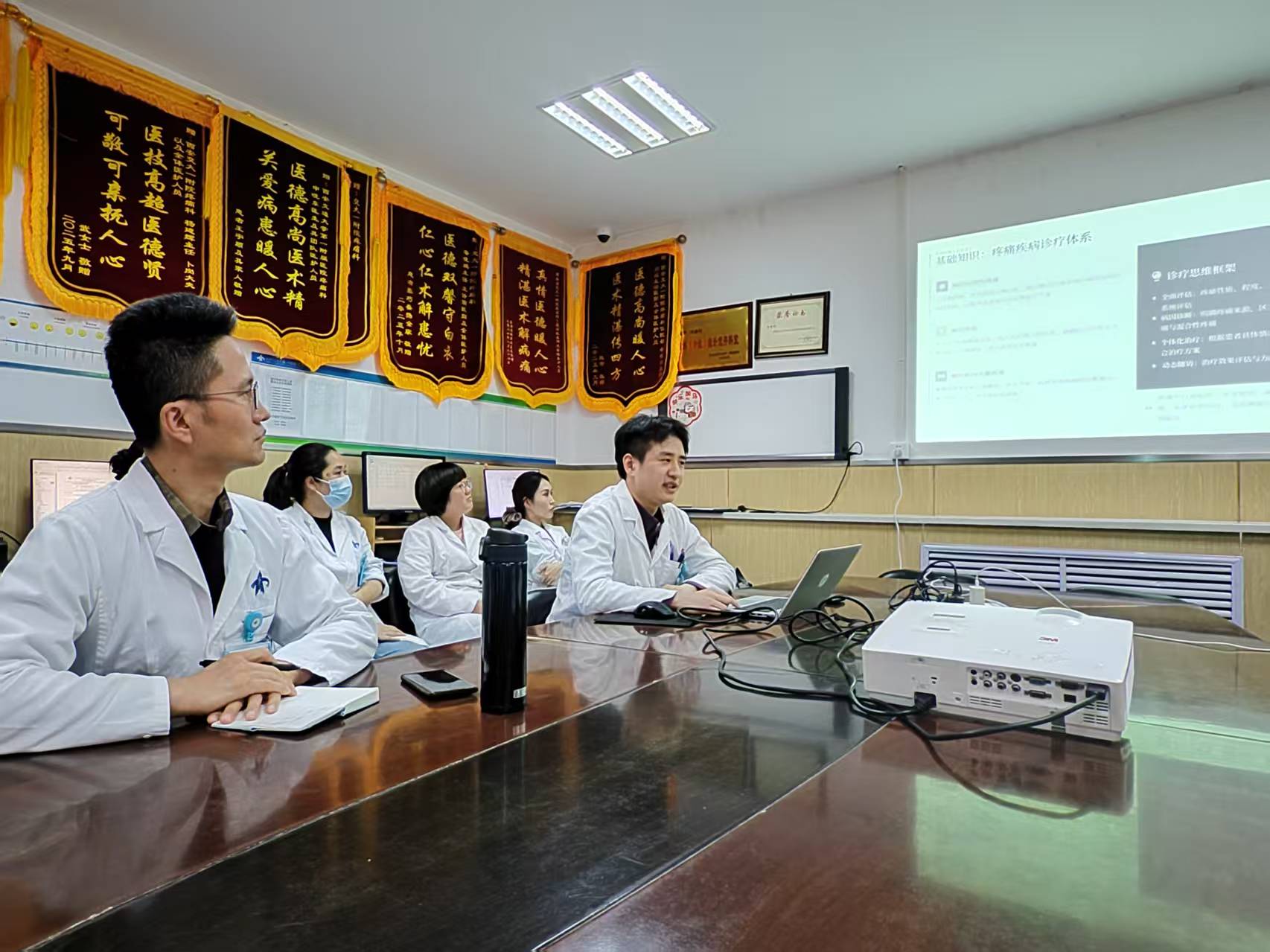 时光荏苒,学业有成。3月5日,西安交通大学第一附属医院疼痛科圆满举办本期进修医师结业汇报暨表彰座谈会,为来自全省各地的五位进修医师这段充实而珍贵的进修学习画上圆满句号。五位进修医师分别是镇安县医院刘航、陕西省中医医院张瑞、咸阳市中心医院段浩、千阳县人民医院王文涛、汉中铁路中心医院刘冉,因对疼痛医学的热爱与追求,从三秦大地不同地区相聚于交大一附院疼痛科,开启了一段共同学习、共同进步的成长之旅。汇报会上,5位医生依次分享了他们在进修期间的所学所感。在科室主任及全体带教老师的悉心指导下,五位医师系统学习了慢性疼痛规范化诊疗、神经阻滞技术、脊髓电刺激技术、鞘内镇痛泵技术等微创介入治疗,以及带状疱疹性疼痛以及癌痛全程管理、多模式镇痛理念等核心内容,全程参与临床查房、病例讨论、手术观摩、门诊诊疗及学术交流。大家珍惜学习机会,虚心求教、勤于实践,在临床思维、操作技能、诊疗规范等方面均得到显著提升。