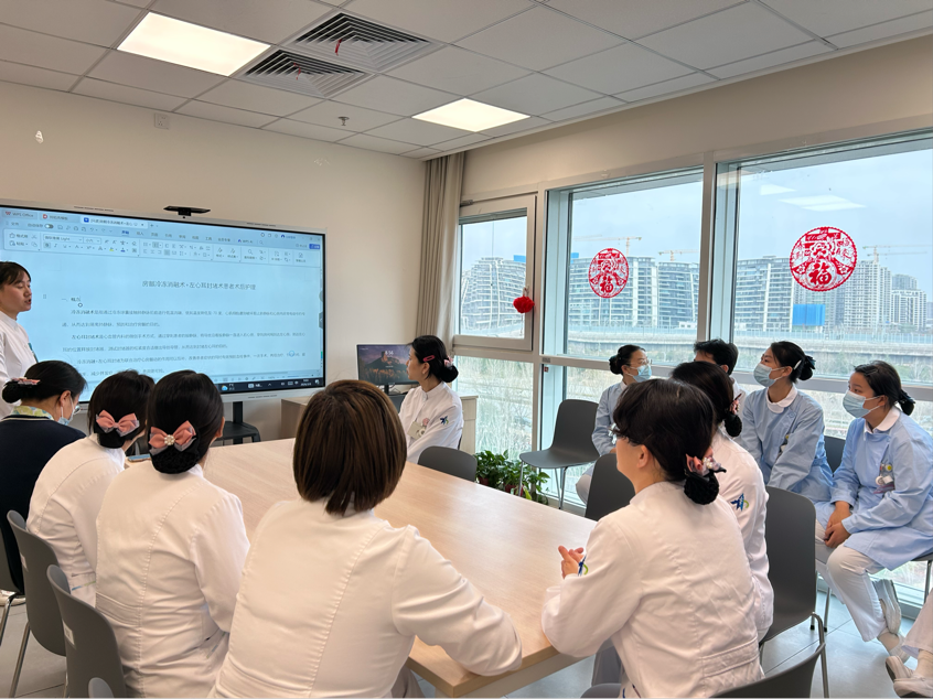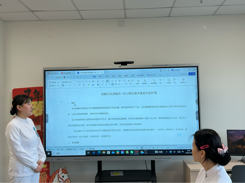 晨交班结束后,培训在会议室正式开始。李主管护理师首先引入病例,根据病例讲解了相关定义等内容,随后结合专家团队诊疗特点,围绕房颤冷冻消融术与左心耳封堵术的手术原理、核心护理要点、并发症观察、康复指导等内容进行细致讲解,最后,进入病房进行了现场学习并提问相关知识要点。本次培训重点聚焦术后生命体征监测、穿刺部位护理、抗凝药物观察、饮食与活动指导等关键环节,通过现场示范、要点拆解、疑问解答的方式,将理论知识与临床实操紧密结合。