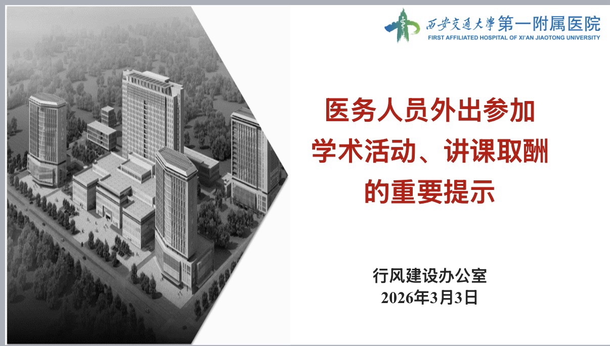 为进一步加强医疗行业行风建设,强化医务人员廉洁从业意识,规范外出参加学术活动及学术讲课取酬行为,2026年3月18日上午,西安交通大学第一附属医院陆港院区心内CCU在科室内组织开展专题培训。此次培训由孙佳佳护理师进行讲解,心内CCU全体医护人员参加学习。