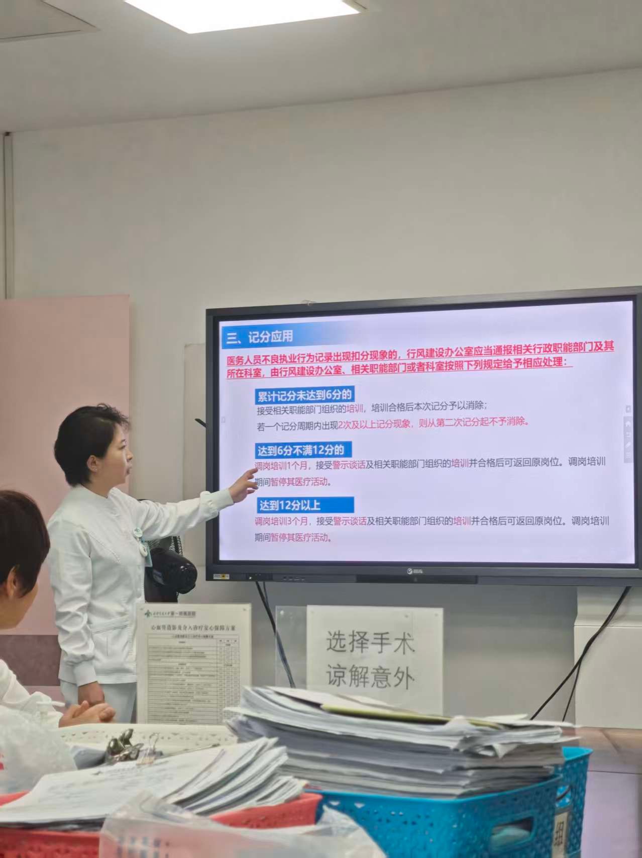 会上,王珍主管护理师结合临床工作实际,对相关管理办法及重要提示进行了深入浅出的解读。重点强调了不良执业行为的具体界定、记分标准及相应后果,同时详细阐述了医务人员外出参加学术活动的审批流程、行为规范以及讲课取酬的合规要求。
