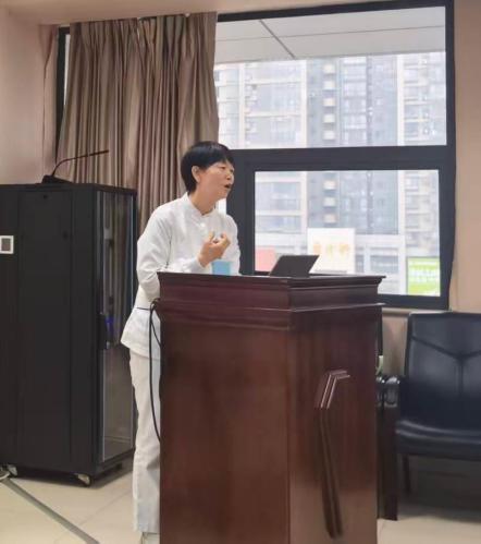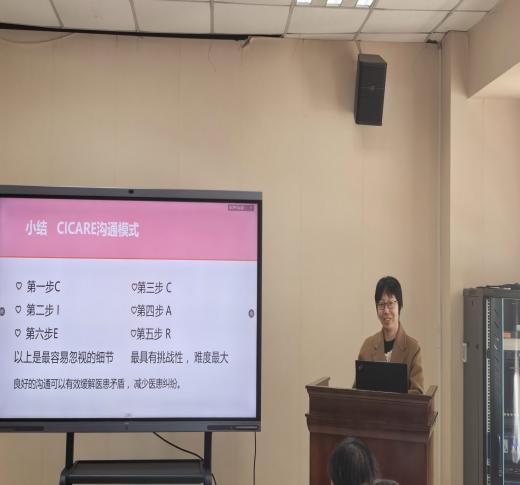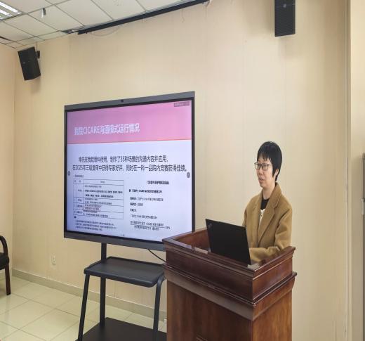 在经验分享环节,门诊部范荣护士长围绕“CICARE沟通模式”作了专题交流。她介绍,CICARE是一种流程化、标准化的护患沟通模式,包含接触、介绍、沟通、询问、回应、退出六个步骤,强调在每一次护患互动中传递尊重与关怀。范荣护士长结合门诊工作实际,从导诊护士、分诊护士、采血护士三个岗位切入,分别展示了不同场景下的沟通模板与操作流程,通过典型案例生动呈现了该模式在优化服务体验、提升患者满意度方面的显著成效。她表示,CICARE的关键在于“习惯成自然”,只有将规范内化于心、外化于行,才能真正实现有温度的护理。