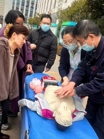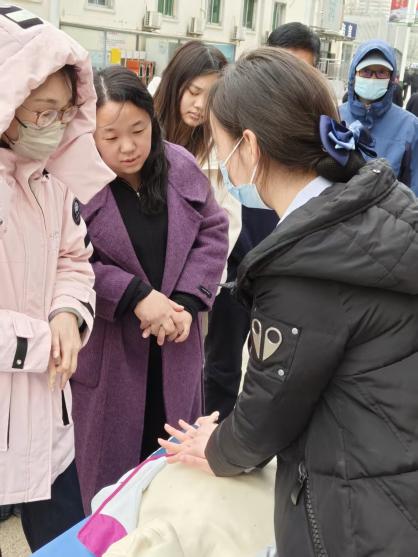起初,围观的人群显得有些拘谨,面对床上放置的急救模拟人,大家的第一反应往往是后退一步。徐玥站在模拟人一侧,双手交叠,开始演示。“按压的位置是两乳头连线中点,深度5-6厘米,频率100-120次/分,要跟上《最炫民族风》的节奏。”围观者听得格外认真。人群中,一位中年大叔不由自主的跟着动作比划起来,注意到大家的参与度提高了,便鼓励大家:“现在,大家可以轮流来尝试一下,实践是掌握技能的最好方式。”人群中的紧张气氛彻底消散,取而代之的是跃跃欲试的热情。大叔走上前,按照指导,开始尝试胸外按压。他的动作虽然有些生疏,但在王小悦和徐玥的鼓励和指导下,逐渐变得规范起来。随着更多人加入实践,现场的气氛变得活跃起来。
