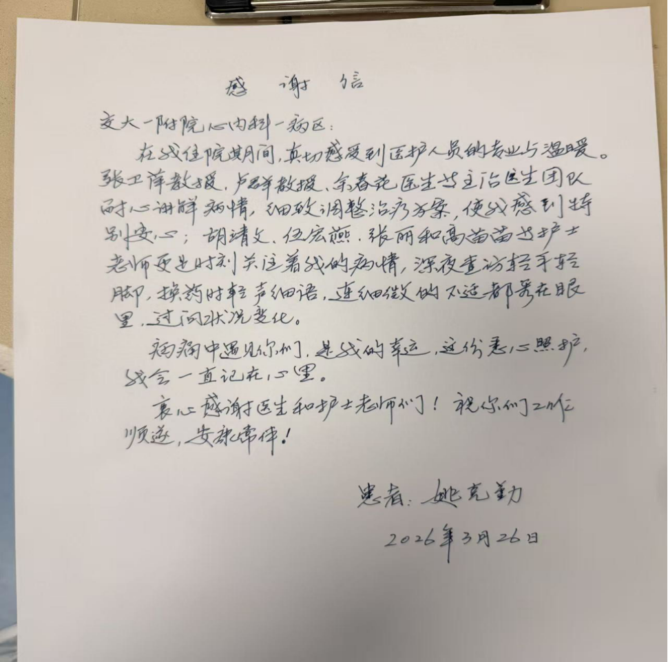 没有惊天动地的壮举,唯有润物无声的坚守;没有豪言壮语的承诺,唯有精益求精的付出。心内科医护人员始终将患者安危放在心头,以白衣为铠甲,以仁心为底色,用坚守诠释医者使命,用专业守护群众“心”健康。这封表扬信,是对他们默默付出最真挚的褒奖,更是他们践行医者初心、传递温暖力量的生动缩影。