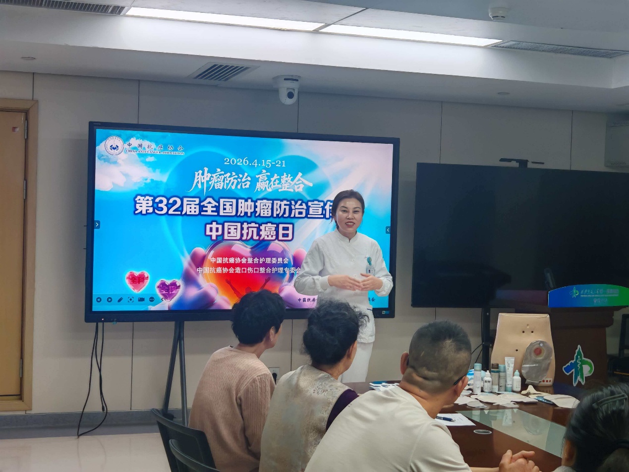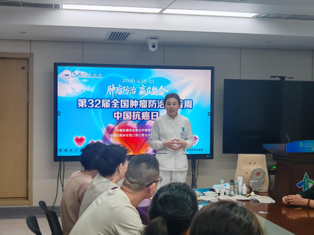 人间四月,春意盎然,为深入贯彻“健康中国,预防为主”的理念,进一步普及肿瘤防治知识,在中国抗癌日到来之际,中国抗癌协会倡导举办第32届全国肿瘤防治宣传周活动,我院伤口造口失禁护理专业组积极响应号召,在中国抗癌协会造口伤口失禁整合护理专委会和院护理部健康教育组的组织和指导下,4月16日下午由专委会副主委、我院综合外科第一辖区乔莉娜总护士长、普通外科王惠君副护士长、泌尿外科白晓静护士长、陈萌副护士长共同组织,在外科楼八楼会议室开展了“共筑健康防线 守护生命希望”的造口术后护理科普宣传活动。参加活动的有来自普通外科、泌尿外科的造口患者及家属们。