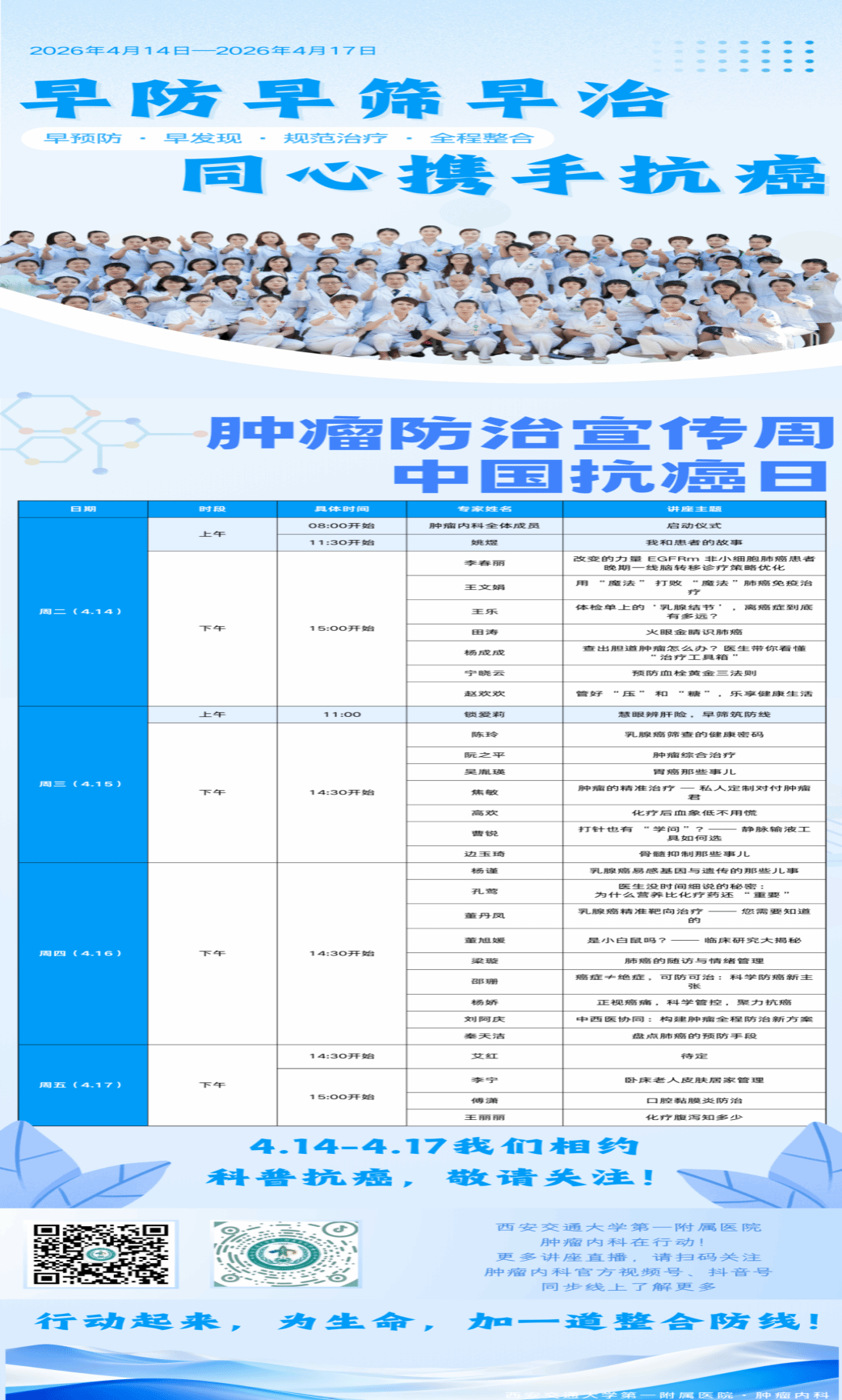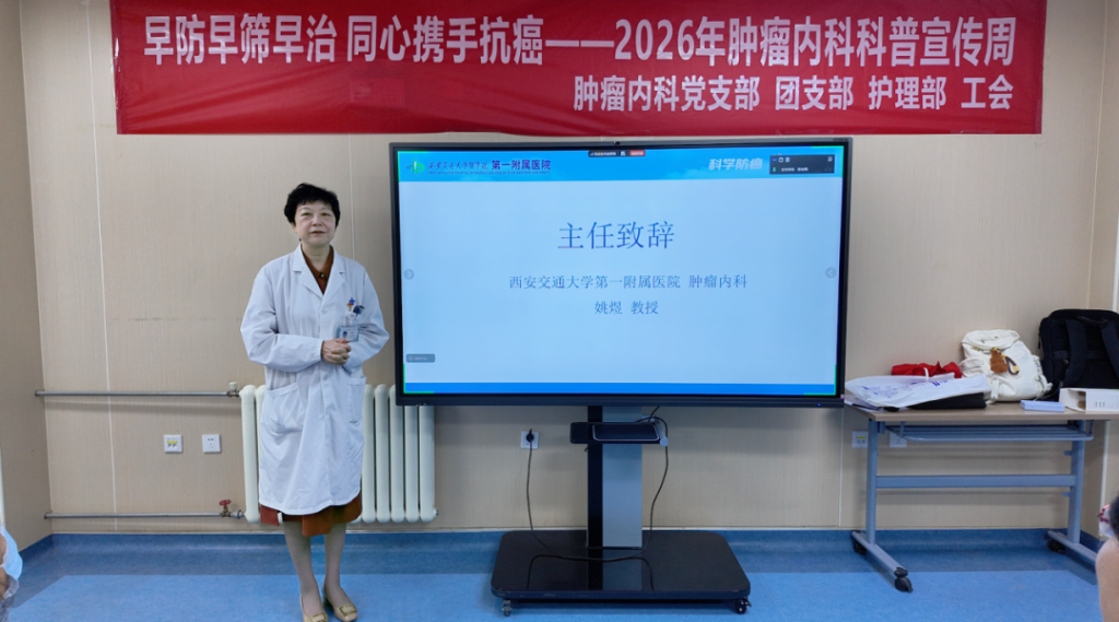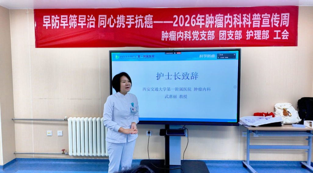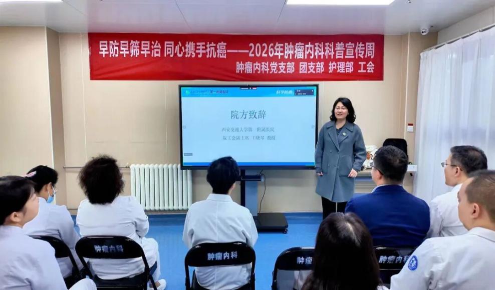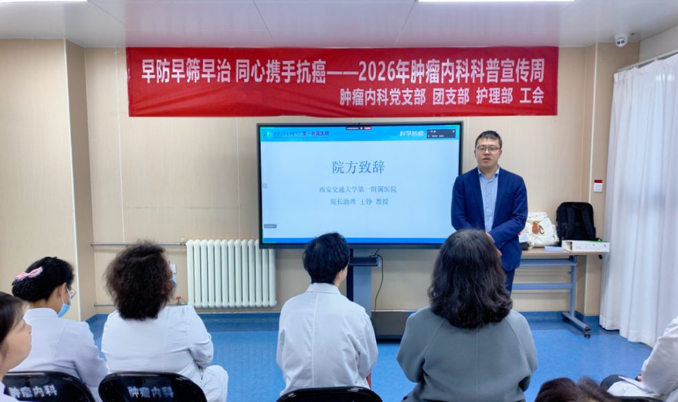 2026年4月14日08:00,在西安交通大学第一附属医院肿瘤内科四楼中厅2026年肿瘤防治宣传周启动仪式举行。本次活动以“早防早筛早治 同心携手抗癌”为主题,正式拉开为期4天的系列科普抗癌活动序幕。