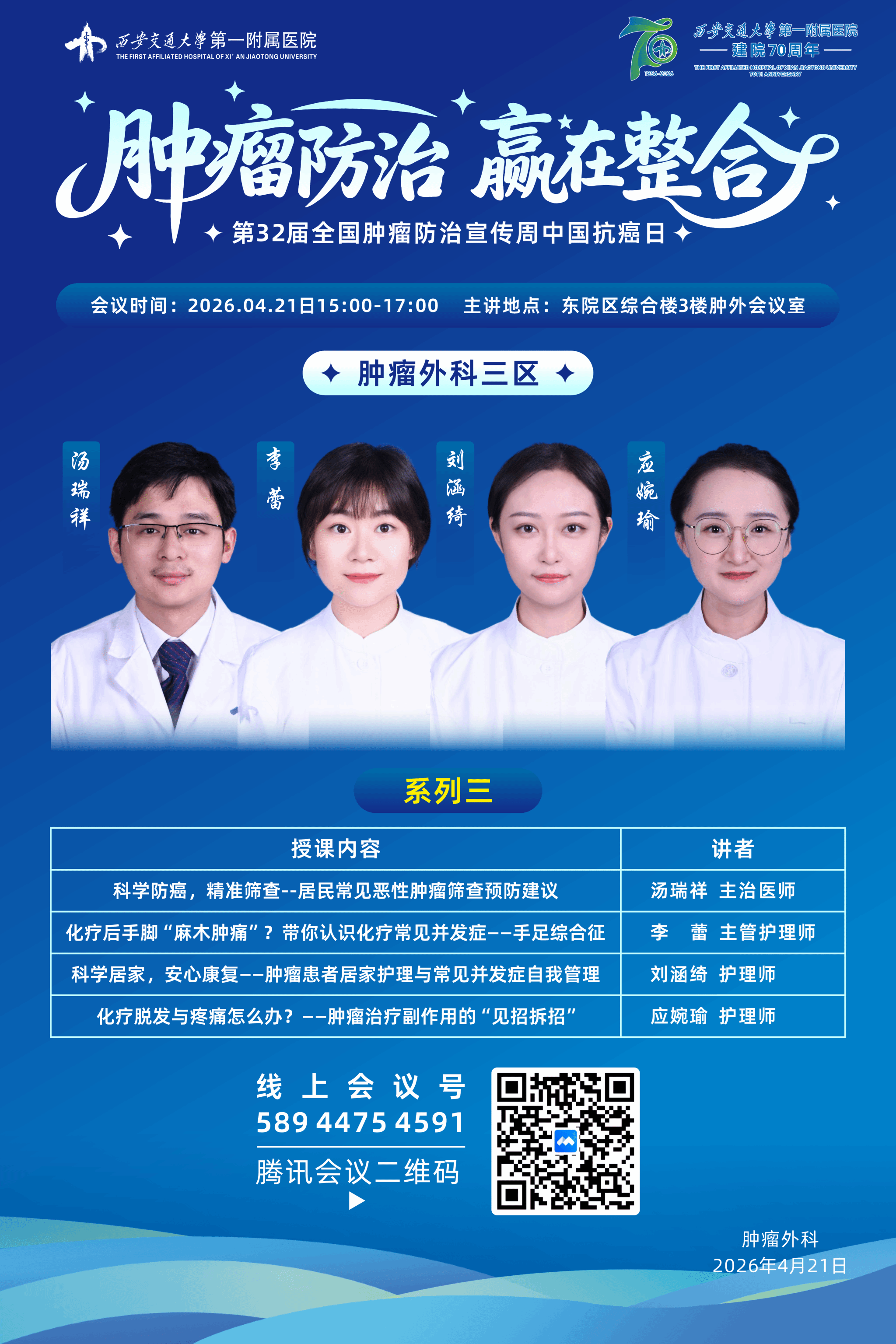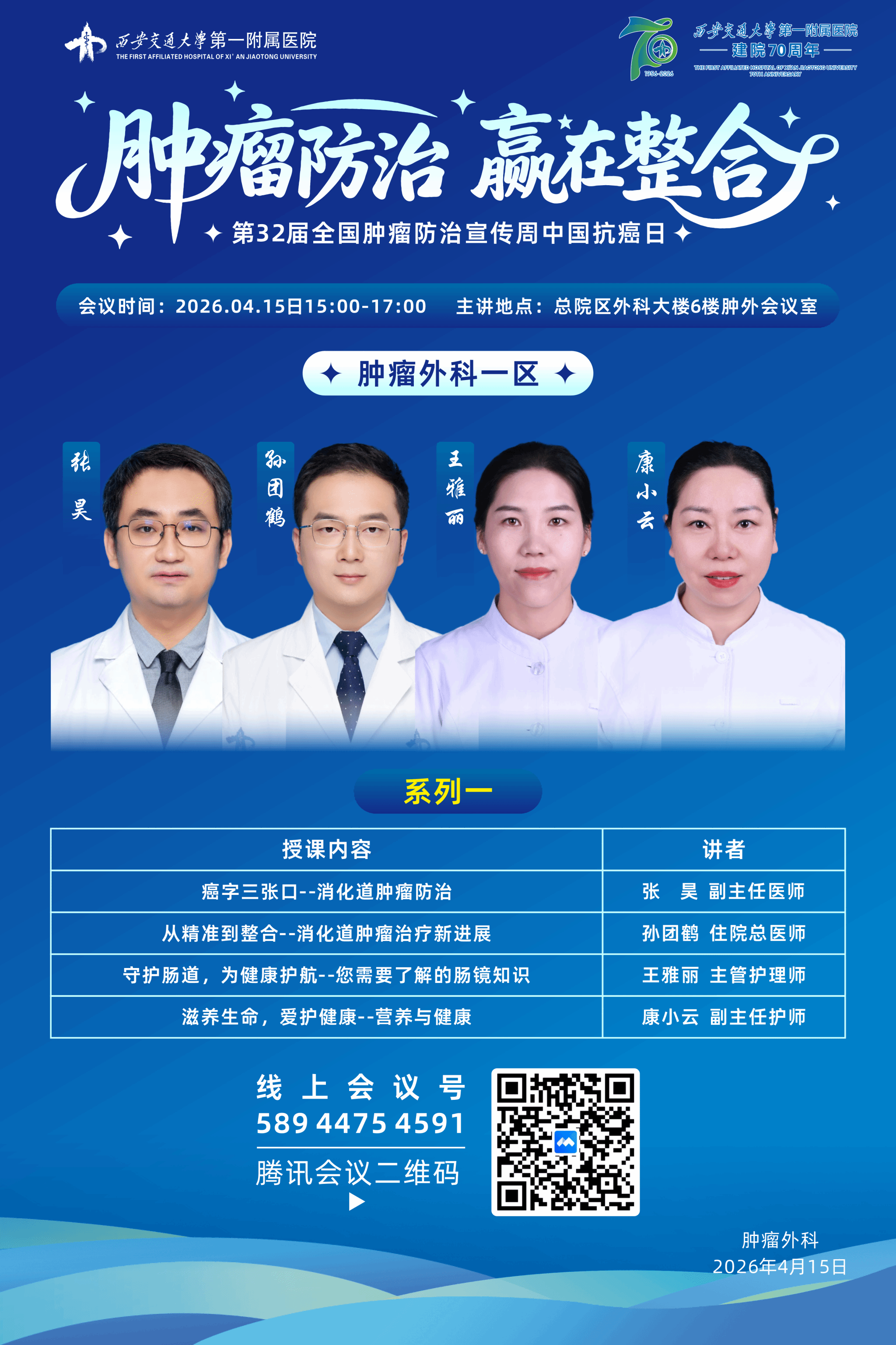 为积极响应“健康中国”战略,进一步提升消化道肿瘤的早筛早诊早治与综合救治水平,推动肿瘤防治工作从“以治疗为中心”向“以健康为中心”转变,2026年4月15-21日第32届全国肿瘤防治宣传周中国抗癌日期间,肿瘤外科围绕“肿瘤防治,赢在整合”这一主题,以“早防早筛早治,同心携手抗癌”为核心内涵,组织一病区、二病区、三病区先后开展开展系列健康宣讲活动,活动围绕精准治疗、整合医学、患者康复与护理支持等核心议题,面向患者及家属传递科学、系统、温暖的防治理念,形成覆盖预防、治疗、康复全过程的整合防治新格局。