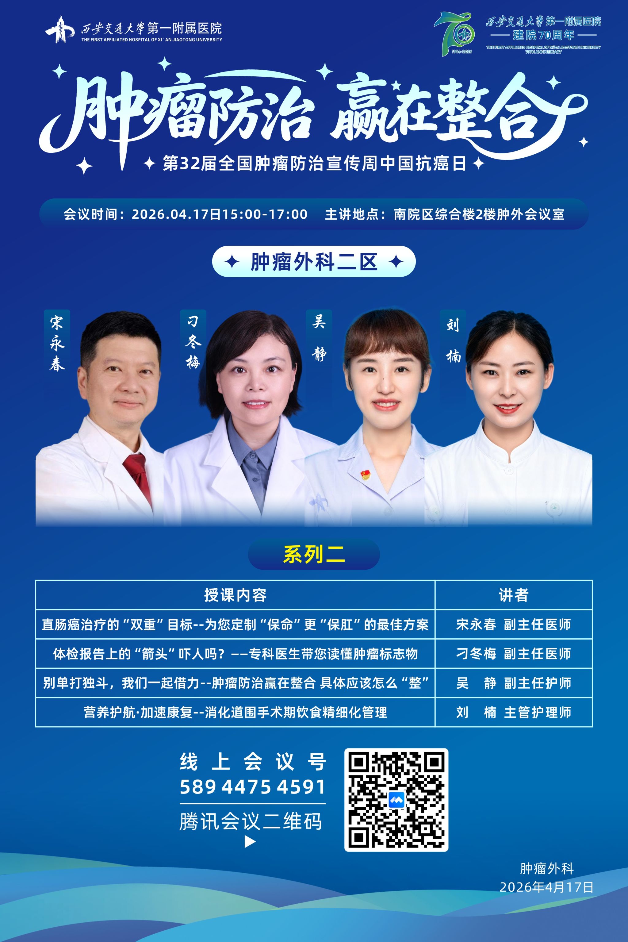 4月17日二病区以“保命”更“保肛”为目标,宋永春副主任医师以《直肠癌治疗的“双重”目标——为您定制“保命”更“保肛”的最佳方案》为题,深入讲解低位直肠癌在规范化疗、放疗及微创手术技术发展下,如何实现肿瘤根治与肛门功能保留的平衡,帮助患者重拾生活尊严。刁冬梅副主任医师带来《体检报告上的“箭头”吓人吗?——专科医生带您读懂肿瘤标志物》,通过真实案例解读CEA、CA19-9等常见肿瘤标志物的意义,提醒公众“单项轻度升高不等于患癌”,避免过度恐慌,同时强调动态观察与联合筛查的重要性。吴静副护士长以《别单打独斗,我们一起借力——肿瘤防治赢在整合,具体应该怎么“整”》为题,从心理支持、多学科协作(MDT)、中西医结合、社会支持系统等维度,阐释“整合医学”在肿瘤防治全周期中的落地路径。刘楠主管护师围绕《营养护航·加速康复——消化道围手术期饮食精细化管理》,详细讲解了术前预康复营养补充、术后渐进式饮食过渡及常见并发症(如腹胀、腹泻)的饮食应对策略,强调“营养即治疗”理念。