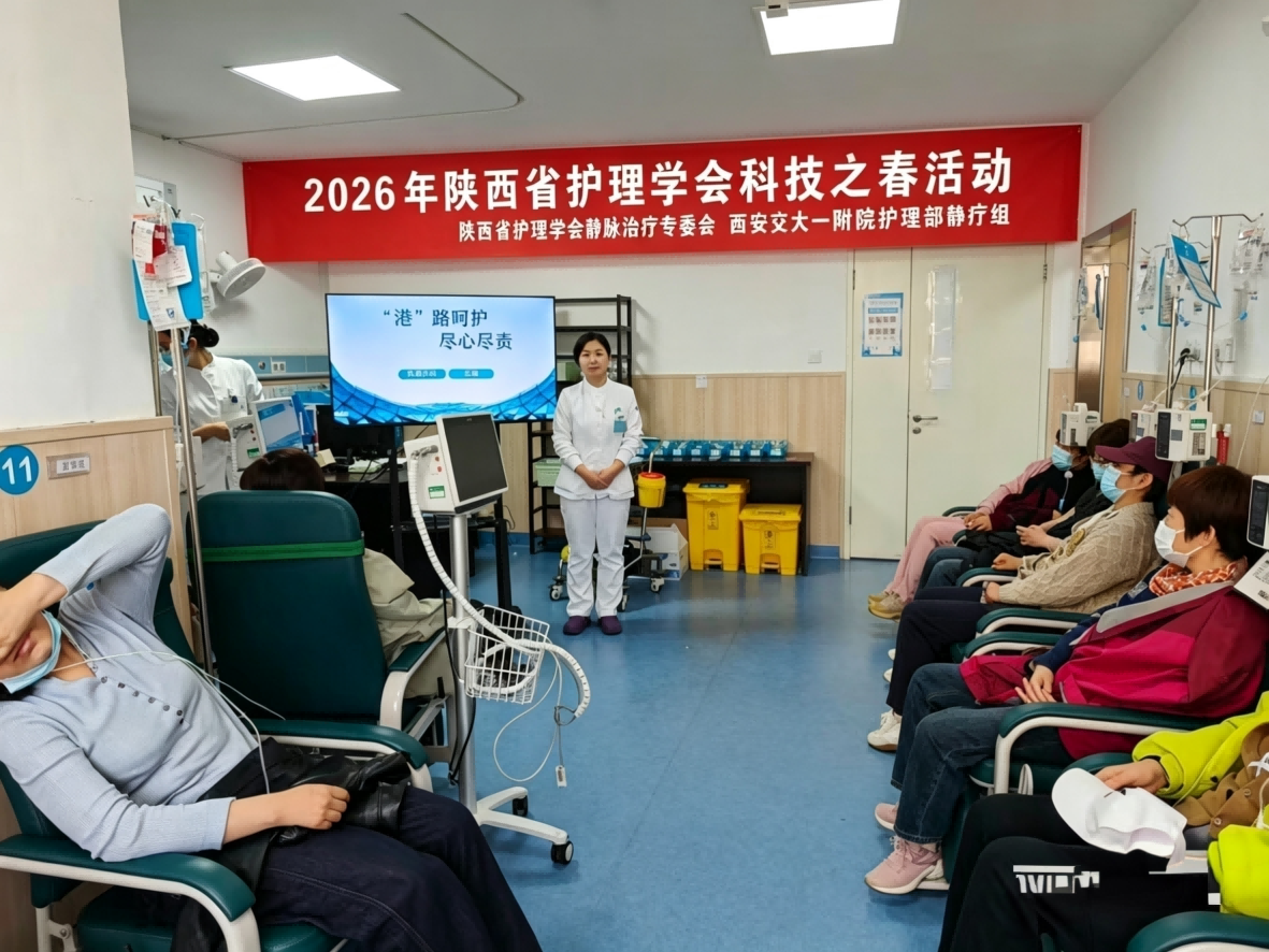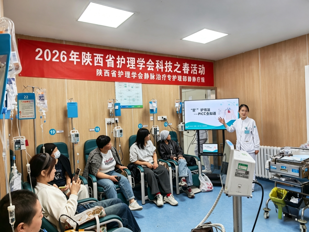 春风送暖,科普同行。为积极响应2026年陕西省护理学会“科技之春”科普宣传月号召,依托陕西省护理学会静脉治疗专委会平台,西安交通大学第一附属医院护理部静疗组联合乳腺外科,面向病区住院患者家属、门诊化疗输液患者,开展系列静脉通路专项健康科普公益宣讲活动,用专业护理知识守护患者生命输液防线。