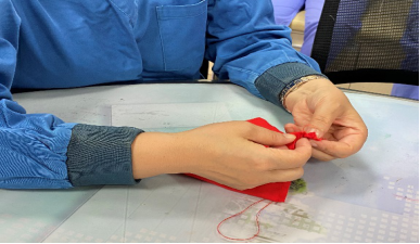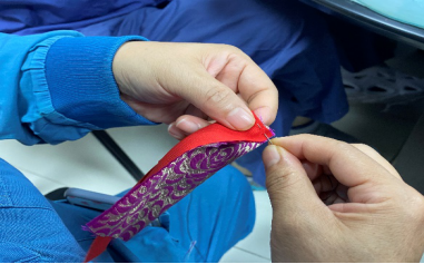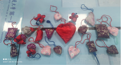 活动第二项便是“制作香包送自己”环节。作为本次活动的重点环节,大家对此早已翘首以盼。首先由杨宏娟老师与大家分享了几种简单上手的香包包法,如“粽子形”、“桃心形”、“元宝形”、“石榴形”等。对缝制方法逐一进行现场演示,并以事先制作好的成品作为参考,充分发挥各自的技能。紧接着便是个人秀环节啦,老师们早已跃跃欲试,争先恐后的寻找自己所需的材料,亲手制作起自己专属的端午香包,现场气氛热烈。本次活动圆满结束。