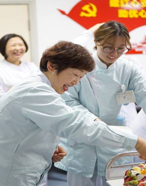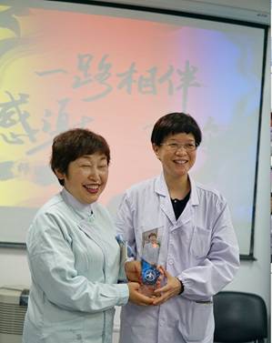 欢送仪式当天,护士长假称病房人手紧张,需要闵老师来加班,8点整病区医护联合交班结束大屏幕亮起,文化组精心制作的记录闵老师各种工作生活瞬间的视频开播,背景音乐响起,蛋糕推进来,主任为她颁发奖杯、护士长送上礼物、年轻护士献上鲜花,所有医护人员送上掌声…..意外之喜让闵老师激动又感动,回顾36年的职业生涯,在场的所有人都热泪盈眶,有留恋、有祝福,有欢喜,有不舍……纷纷送上祝福,衷心祝闵老师开启新的人生旅程,健康平安幸福快乐!