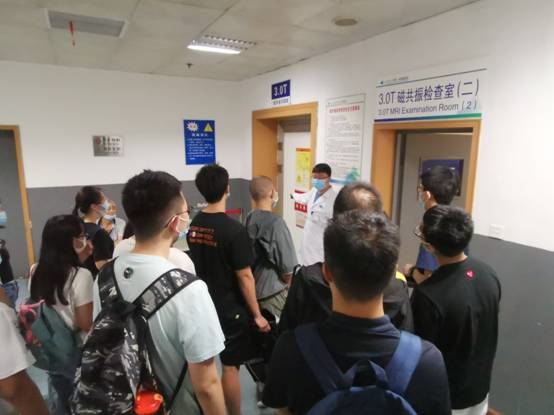 最后,见习同学根据班级分成了三组,由李军军、樊钢练、宋哲凡、郝辉、曹乐、王歌亮等老师带领对科室进行了实践,分别到3.0T磁共振、256排高端CT、普放等机房进行了学习。各位老师分别向同学们讲解了X线、CT、磁共振成像的原理、检查流程、注意事项、常规检查方法、新技术应用等,让同学们走进医学影像实际岗位中学习相关基础及前沿知识,为将来的发展方向增添了一个很好的选择。
