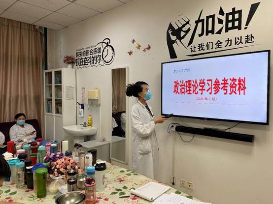 首先,杨文超组长向大家传递了医院例会和药学部例会的精神,杨悦副组长带领大家学习了《学习习近平总书记在庆祝中国共产党成立100周年大会上的重要讲话》:要坚持以习近平新时代中国特色社会主义思想为指导,增强“四个意识”、坚定“四个自信”、做到“两个维护”、“九个必须”,以史为鉴、开创未来。