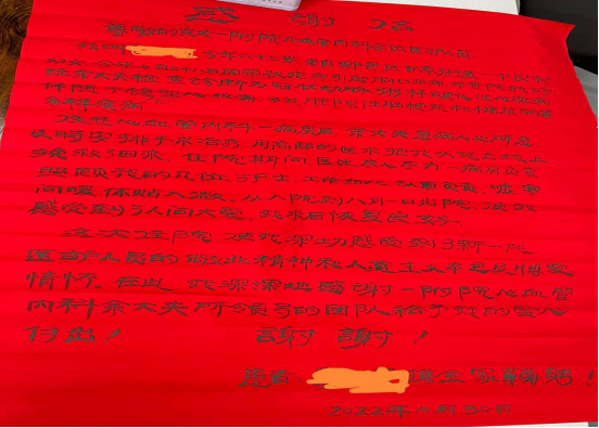 这次住院使我深切感受到了新一代医护人员的敬业精神和人道主义本色及博爱情怀,在此,我深深地感谢一附院心血管内科余大夫团队给予我的爱心付出。