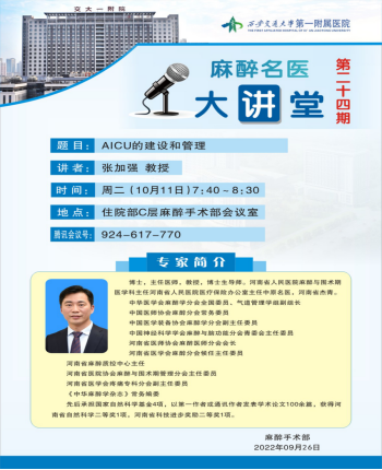 为了提升手术患者的围术期安全和管理质量,促进麻醉学科发展,麻醉学科逐步向围术期医学科转变发展。为适应我院手术患者围术期恢复质量提升,西安交通大学第一附属医院于2019年9月正式成立麻醉重症监护室(Anesthesia Intensive Care Unit,AICU)并投入使用,在开展工作的过程中,麻醉科不断的完善环境设置、人员管理,并改进管理模式和运行流程。为了更好的建设和管理AICU,举办了《麻醉名医大讲堂》系列讲座之AICU建设和管理专题讲座分享,2022年10月11日7:40--8:30通过线上、线下形式在麻醉手术部本部和东院区同时举办,本期名医大讲堂邀请到河南省人民医院麻醉与围术期医学科主任张加强教授进行分享。麻醉手术部200余名医生护士共同参加。