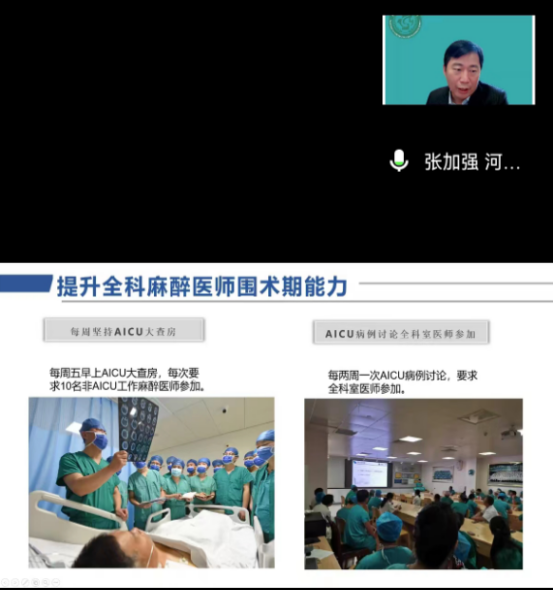 张加强主任的授课系统的介绍了河南省人民医院AICU的发展历程、医护人员构架、床位配比、收治标准及病种、制度建设、管理模式,并利用典型病例图文并茂的为各位同仁展示了AICU医护团队相互配合,以术后患者快速康复为己任,聚焦生命体征和内环境监测与调控,保障患者围术期安全,提高术后恢复质量。接着,张教授以问题为导向,详尽阐述了AICU建设后续所要面对的问题。最后对于AICU未来展望,张教授提出了自己宝贵的观点:AICU的开展充分体现了麻醉医生围术期管理危重症患者优势,使手术麻醉风险防范无缝对接到麻醉苏醒和重症监护状态,对围术期患者监测、治疗和抢救提供一个有利的平台,使患者安全渡过围手术期,改善预后。但是,我们也应该看到建设AICU要面临的挑战,AICU具有“跨学科”的特性,各级医院尚处在探索阶段,对各级医院AICU团队人员的能力、术后患者的管理标准与规范、相关学科的支持等等目前还缺少相应的指南参考,因此期待更多的专家学者参与其中,促进麻醉学科深入围术期医学实践。