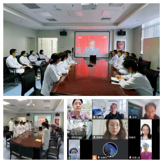 10月16上午10时,血液内科党支部在东一楼9楼会议室集体观看中国共产党第二十次全国代表大会开幕会直播,会议由支部书记贺鹏程主持,全体血液科党员及积极分子线上线下相结合方式参会,并于收看后组织大家畅谈心得体会。