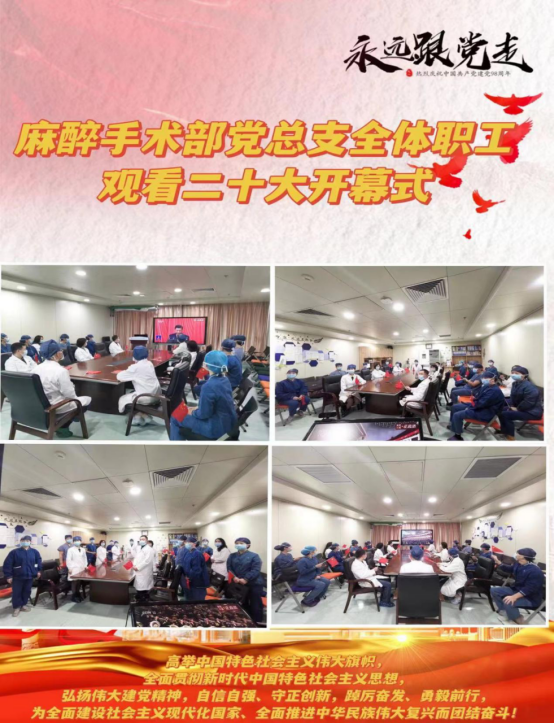麻醉手术部党支部在王强总党支部书记的统筹安排下,由第一党支部盖毅文书记、第二党支部张琳娟书记组织协调,全体党员采取线上、线下相结合的形式认真收看了中国共产党第二十次全国代表大会开幕会。按照大会的流程,麻醉手术部党支部党员们一起起立唱国歌,默哀缅怀毛泽东、周恩来、刘少奇、朱德、邓小平、陈云等已故老一辈无产阶级革命家和革命先烈,并严肃认真的听取了习近平总书记的重要报告。