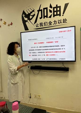 首先,杨文超组长向大家传达了医院例会和药学部例会的精神,杨悦副组长带领大家共同学习了《陕西省人民政府办公厅关于印发推动公立医院高质量发展实施方案的通知、《医疗机构工作人员廉洁从业九项准则》等文件。