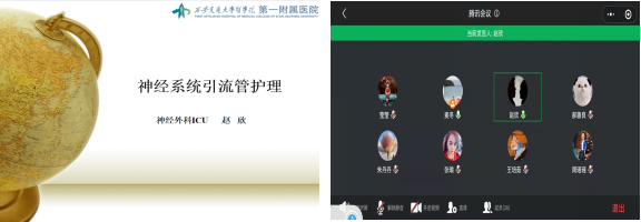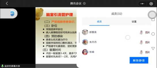 本次培训采用腾讯会议软件进行交流,顺利启动了线上学习模式。首先赵欣护士长为我们详细讲解了神经系统解剖、去骨瓣减压手术。她讲解了常规的去骨瓣减压的方式和手术的作用机制,术后护理中要注意观察头部敷料的情况,以及观察去骨瓣处的脑组织膨隆状态,值得注意的是引流管的护理,包括引流瓶的位置,引流状态的观察等。而脑膜下引流则要注重取平卧位或头低足高位。同时还详细讲解了腰池穿刺持续外引流,预防感染、及时拔管等注意事项。