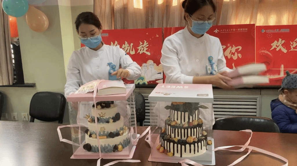 欢迎仪式中,经过提前的精心布置,现场拉起了横幅,在蛋糕、糖果、掌声和拥抱的簇拥下,所有援助隔离病房医疗队队员们依次步入会场。