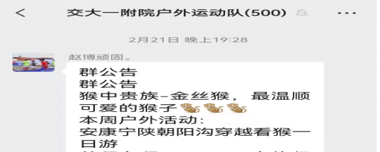 二月的最后一个周末,户外运动队的第二次活动开启了,这次我们去宁陕县朝阳沟看金丝猴,单程车程130KM,大约行驶2小时,本次活动还有十公里的山路,是考验大家耐力和体能的时候了,但也阻挡不了大家对户外活动的热爱;2月21日上周一晚上19:28分赵博团长发出信息,19:44分开始报名,21:42分就报满了。短短的两个小时,名额已满,好多老师还没有报上,纷纷在群里留言,有的要当替补,有的说下一次及时关注;报上的老师呢,也在说下次要互相帮着盯着点儿,可见咱们的户外运动队呢,在职工中吸引力蛮大的,对其抱有很大的希望和寄托,只要是户外队组织的活动,大家都积极踊跃报名,同时也反映出大家对户外运动队工作的高度认可及对活动极高的参与度,鞭策工作人员更好的做好服务及人文关怀。