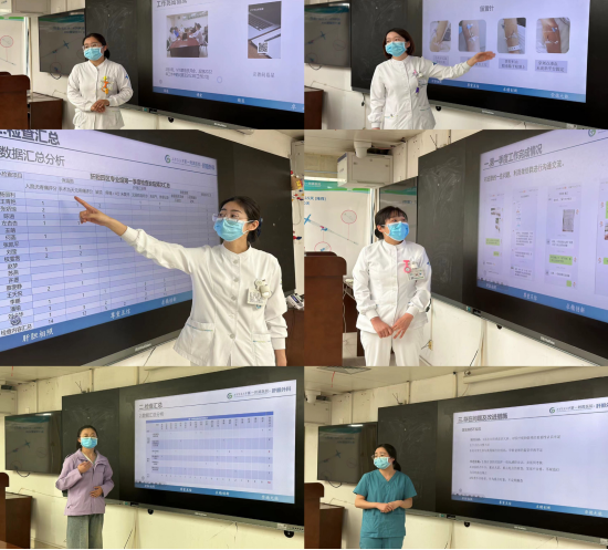 肝胆四区共有9个专业组进行分析汇报。VTE专业组左杏杏护理师,静疗专业组聂莎护理师,肠内营养组苏燕护理师,疼痛专业组蔡文静护理师,老年专业组杨丽利护理师,皮肤专业组王青艳护理师,糖尿病专业组王天悦护士,控感专业组许愿护理师、气道专业组王萌护理师等依次对各专业组第一季度工作进行了总结,反馈了工作中存在的问题以及计划完成情况,并提出完善及解决方案。
