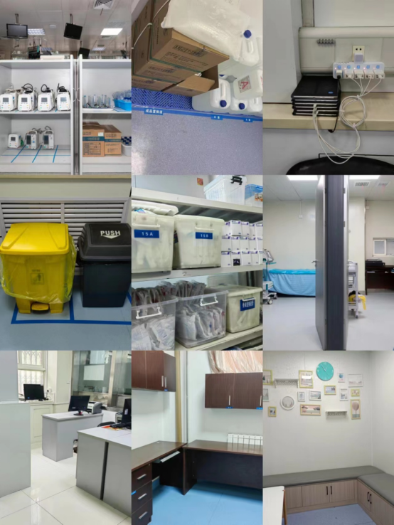 门诊透析室及东一楼透析室治疗区,充分打扫清理,摆放整齐机器,去除表面污渍胶印;定点摆放床单位及其周围物品,检查床栏功能;打扫清洁治疗车,将治疗用物定点放置;清理洗手台,明确标识七步洗手法;定点放置垃圾桶、AB液桶等;整洁设备带;按要求粘贴各种标识;将电视架擦拭干净。