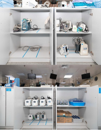 对治疗大厅及走廊进行墙面清理,清理柜顶物品;物品定点放置,标识明确,各类仪器登记编号,按规定位置和编码放置。