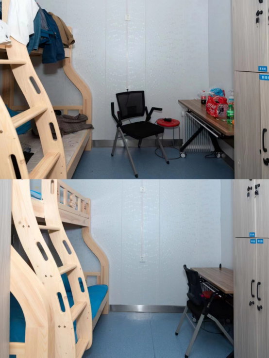 休息区床单被褥干净叠放整齐;清洁柜顶灰尘,清理杂物;工作服与便服分区放置在相应的更衣柜挂钩上;会议室桌椅摆放整洁,桌底电源线,插线板整齐缠绕;冰箱内物品清洁除霜粘贴各类标识。