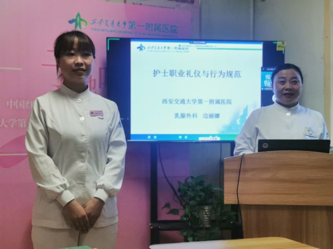 良好的护理礼仪不但能使护理人员在护理实践中充满自信心、自尊心、责任心,还可以创造一个友善、亲切、健康向上的人文环境,护士礼仪是护理人员个人素质、修养行为的综合反映,为进一步提升护理人员的人文素养和职业素质,加强优质护理服务内涵建设,打造温馨舒适的诊疗环境,5月10日交大一附院乳腺外科开展了护士礼仪培训,郭萍利护士长及所有护士参加了此次培训。