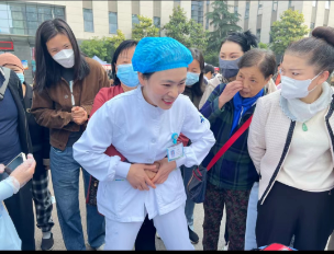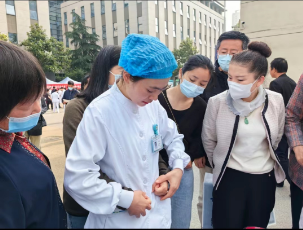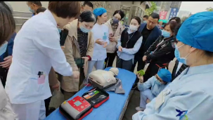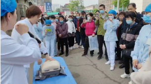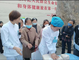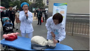 活动开展前,彭当丽老师走到患者家属身边,号召门诊门口广场上的民众,学习急救知识和技能是人人必备家家必有的技能,才能在意外突发时尽自己的力量去挽救生命控制局面,面对突发事件,提高民众的自救他救技能和素养,社会会更和谐。简短的开场后,宣讲活动拉开序幕。首先是心肺复苏技能培训,宣讲员王楠老师通过指出“第一目击者”及时实施心肺复苏的时间节点的重要意义引入心肺复苏急救操作正题,通过院内复苏场景吸引了大家的注意力,大家都跟着宣讲员的节奏为生命的急救着急紧张,接着又分步骤详细讲解,通俗易懂的语言加上王荣老师标准娴熟的操作示范很快获得吸引了大家的注意力。在实践环节,宣讲队员们手把手传授动作要领,纠正和指导每一位上前学习的家属,鼓励人人学急救,才能做到急救为人人。大家都表示,在意外突发时在生命较量中,自己可以第一时间冲上去伸出援手,因为学过、学会了才有底气!