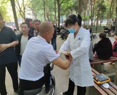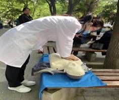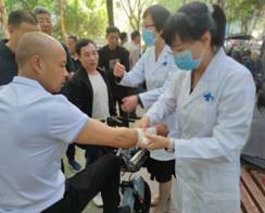 气管异物是生活中常见的急诊,也是大家关注的重点问题,因此,海姆立克急救法也受到在场群众的欢迎;宣讲队成员赵艳和张晓玲现场示范,并指导周围群众进行海姆立克急救法的实践,以群众耳闻能详的“剪刀-石头-布”方法进行指导,使他们快速掌握此项急救技术;群众对止血包扎技术也兴趣浓厚,在宣讲队成员的指导下,有多位群众现场实践,并取得满意效果;在场的群众还咨询了喉头卡鱼刺、枣核、猫抓伤、狗咬伤、烫伤、高热抽搐、蜱虫咬伤等常见问题的现场急救处理方法,宣讲队成员也逐一进行解答,受到群众的一致好评。