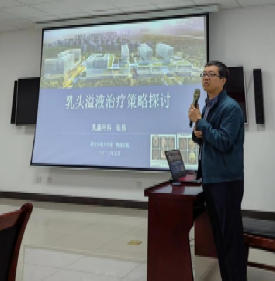 在授课环节,乳腺外科张伟教授为大家带来“乳头溢液治疗策略的探讨”,从乳头溢液的病因到诊治进行了细致讲解。