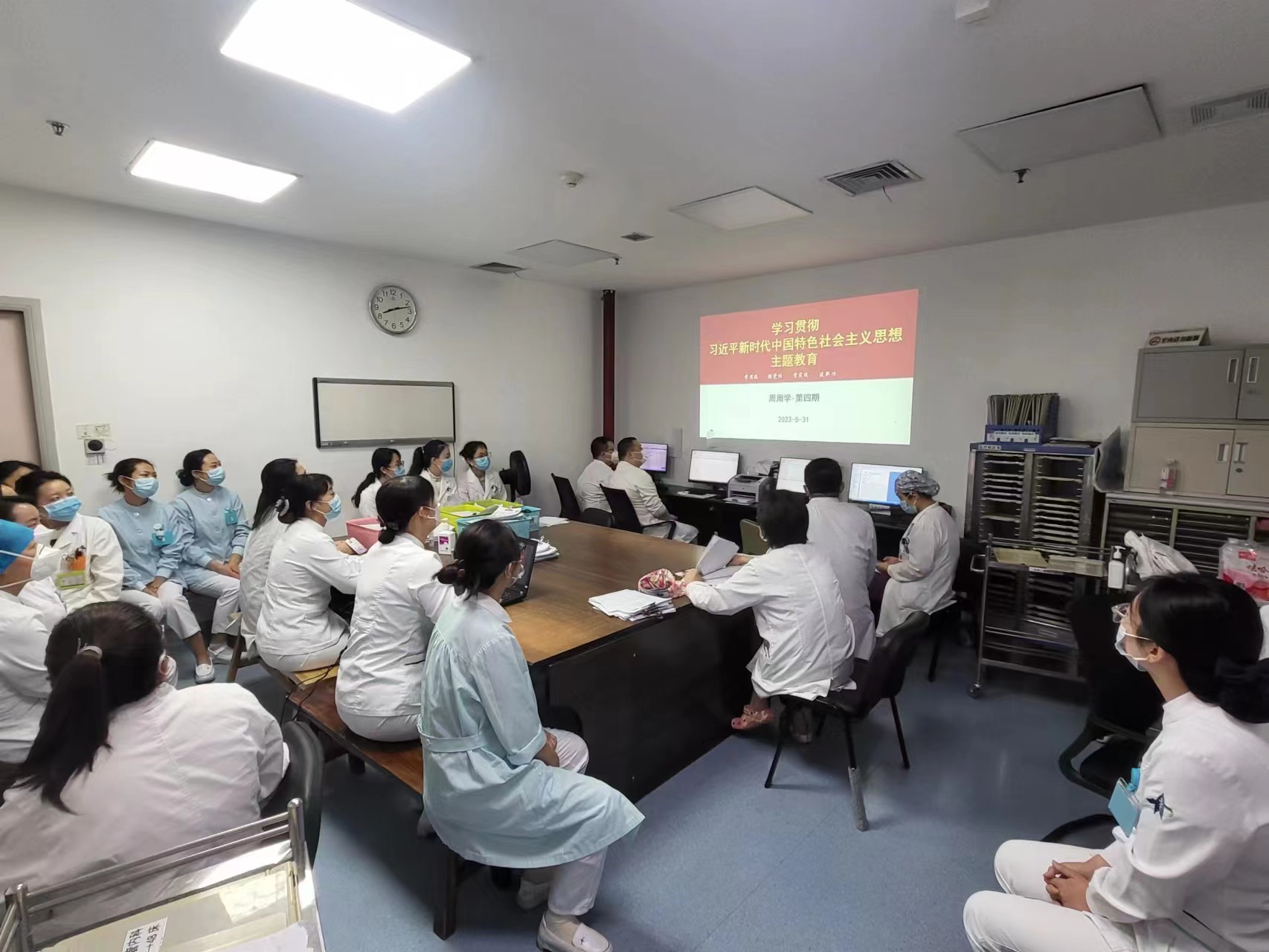 5月31日晨交班后,在白玲主任和刘盈盈护士长的组织下,心内二病区全体党员和非党员职工在医生办公室学习了第四期周周学思想内容。