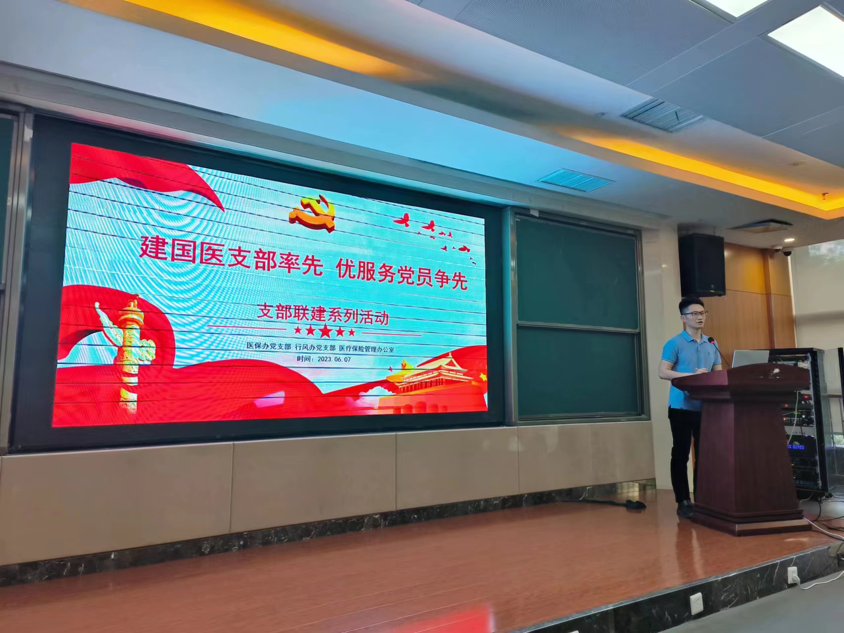 6月7日下午,医疗保险管理办公室党支部联合行风建设管理办公室党支部以及医疗保险管理办公室全体人员在我院科教楼举行支部联建系列活动。活动由医疗保险管理办公室(以下简称医保办)党支部书记每晓鹏主持。