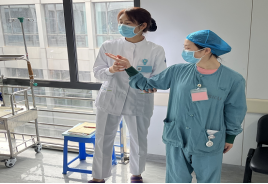 经过老师的一一示范后,我们随机分配,两两成队,对培训内容进行练习,练习后宁婷老师随机抽出两位实习生分别进行培训内容的回示,剩下的人在一旁认真观看同学的演示,发现问题,与老师一起纠正不规范之处。在培训和练习过程中,当我们做出一些并不规范的护士礼仪动作或者做出来的动作滑稽笨拙时,常会引得小组伙伴哄堂大笑,此次培训在轻松愉悦的氛围下圆满结束。