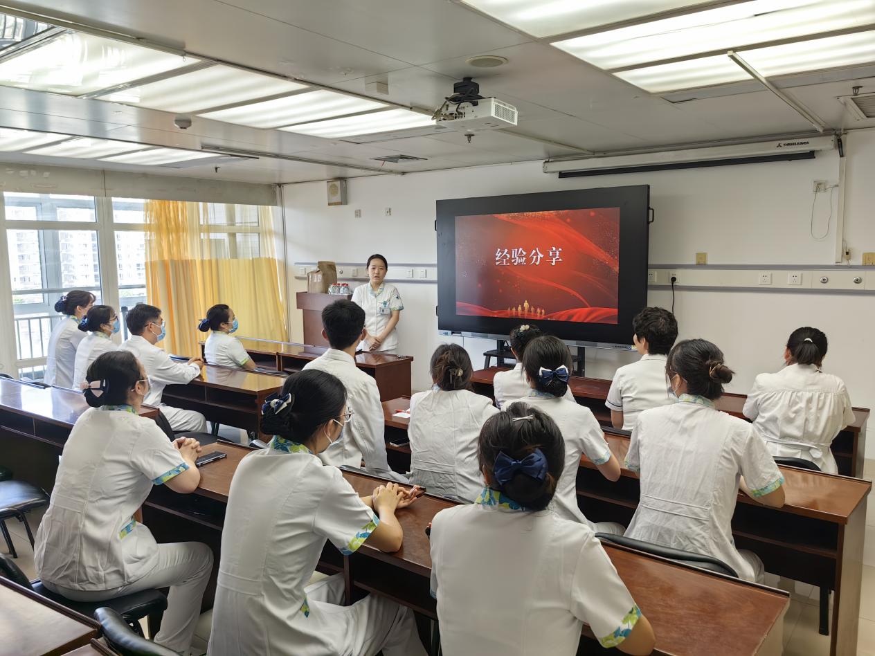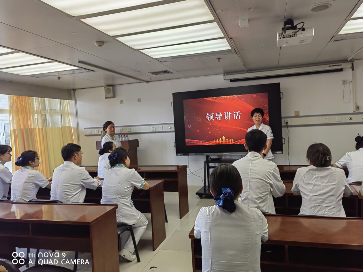 接下来各位新入职护士进行了简单的自我介绍。由上一届优秀的轮转护士杨洁进行经验分享,她从轮转护士的角度,叮嘱大家,作为一名新入职护士,要时刻保持谦逊、好学的态度,向身边的老师多学习,多丰富自己的知识,面对新的挑战,首先要明确目标,从完成每一个小目标开始逐步完善自己,尽快熟悉环境、了解科室、了解专业,更好地服务患者。