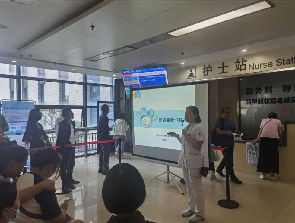 为了普及胸科疾病的相关知识,给门诊就诊患者在等待就医的过程中带来疾病相关知识,同时提升患者满意度,胸外科健康教育小组成员每季度持续在门诊为就诊的患者及家属进行健康教育知识宣教。2023年8月30日上午,在胸外科樊晓娥总护士长和康莉护士长的领导下,以及在门诊部范荣护士长大力支持下,胸外1区健康宣讲师焦健方和胸外2区健康教育宣讲师姚璇在胸外科门诊候诊区域开展了一场主题为“肺癌离我们有多远?”“肺结节的诊治和预防”的健康宣教活动。